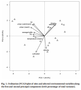 PCA分析:軸1(44.6%方差)代表污染梯度,城市化/農業用地與DO赤字、高分解率顯著正相關(圖1)。