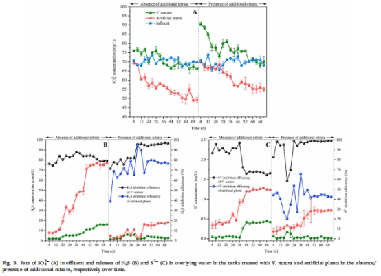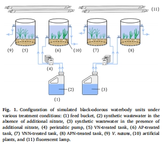 本研究通過實驗室模擬黑臭水體,探究了苦草(Vallisneria natans)在添加硝酸鹽條件下對硫化氫(H?S)和硫離子(S2?)釋放的抑制作用。核心發現包括: