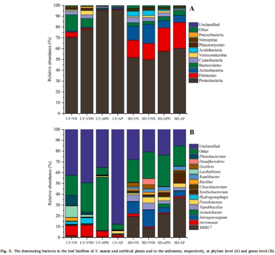 微生物群落:16S rRNA測序分析葉片生物膜和沉積物(圖5)。