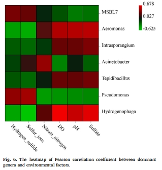 微生物群落重構:硝酸鹽降低沉積物中硫酸鹽還原菌(SRB,如MSBL7屬)豐度,同時增加苦草葉片生物膜中硫氧化菌(SOB,如Aeromonas)和硝酸鹽還原型硫氧化菌(NR-SOB,如Hydrogenophaga)的豐度(圖5)。環境因子(DO、pH、硝酸鹽)與微生物群落變化顯著相關(圖6)。