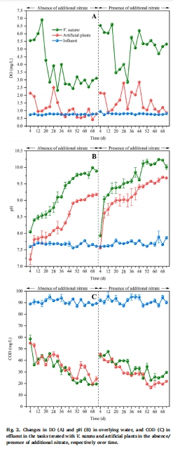 數據:苦草使DO從1.1 mg/L(AP組)升至5.2 mg/L(VNN組),pH從7.66升至10.01。