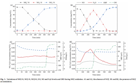 數(shù)據(jù):低DO下NH?OH+NO??共存時(shí),NO/N?O峰值達(dá)0.225/4.529 mg-N/L,且持續(xù)時(shí)間長(zhǎng)。