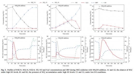 NH?OH添加加劇氣體排放:氨氧化過(guò)程中添加NH?OH顯著提升NO和N?O產(chǎn)量(圖3A2),高DO下N?O峰值達(dá)0.698 mg-N/L。