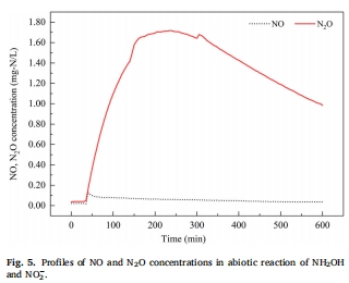 非生物反應(yīng)貢獻(xiàn)顯著:NH?OH與NO??的化學(xué)反應(yīng)可直接生成N?O(峰值1.719 mg-N/L),占?xì)怏w總產(chǎn)量的30%以上(圖5)。