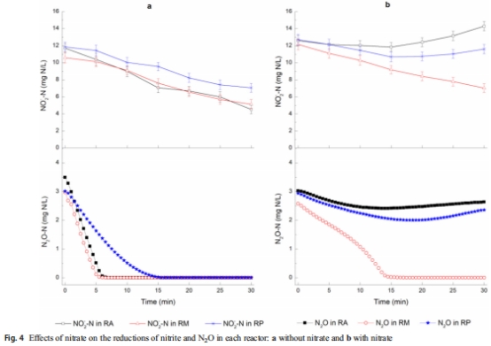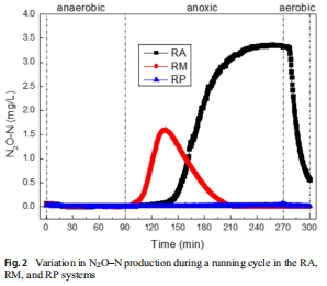 電極捕捉到RA系統(tǒng)在150分鐘后N?O急劇上升至3.3 mg N/L,而RP系統(tǒng)始終接近0 mg N/L。