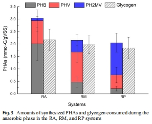 RA系統(tǒng)PHAs合成量最高(3.0 mmol-C/g VSS),PHB占比66.1%;RP系統(tǒng)PHAs合成量最低(2.0 mmol-C/g VSS),PH?MV占比63%(圖3)。