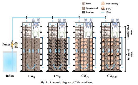 建立4組垂直流CWs:對照組(CWB)、生物炭組(CWC)、鐵屑組(CWFe)、Fe-C組合組(CWFe-C)(圖1)。