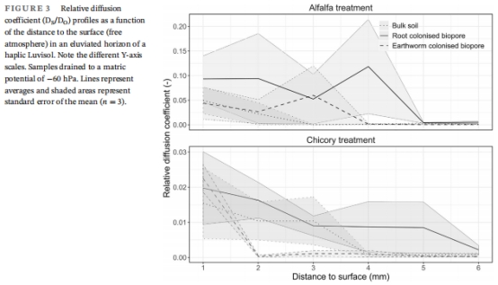 擴散效率隨距離衰減:根際在5 mm處仍保持0.03,蚯蚓孔在3 mm趨近于0。