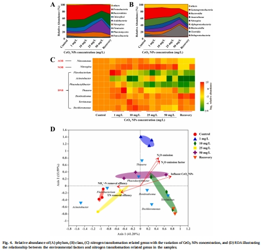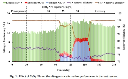 證明CeO? NPs劑量依賴性地抑制BNR(高濃度時顯著降低脫氮效率),并導致溫室氣體N?O排放增加。