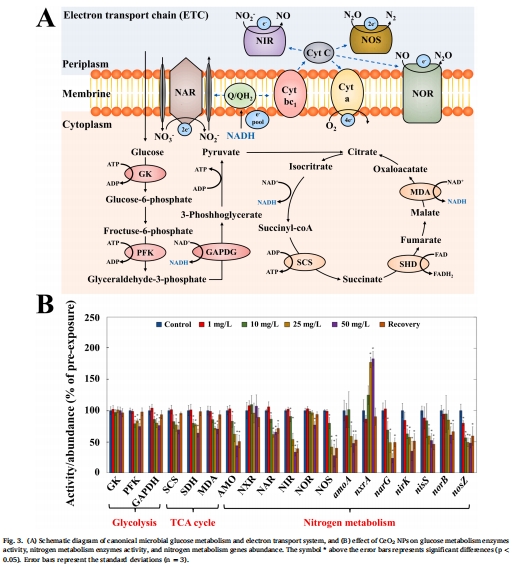 機制核心:NPs抑制NOS活性(Fig. 3B)和反硝化菌(如Flavobacterium)代謝,通過干擾電子傳遞(ETS活性下降)和酶功能。