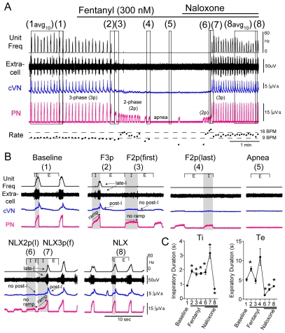 芬太尼導致呼吸從三相模式(含吸氣后階段)→雙相模式(無吸氣后)→呼吸暫停。