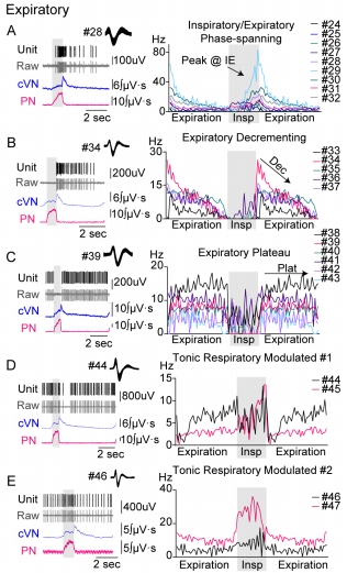 基線期:記錄正常三相呼吸(inspiration, post-inspiration, late-expiration)下的神經元活動。