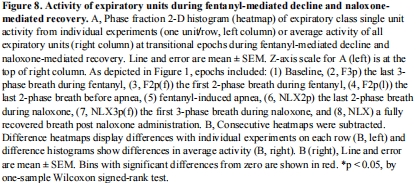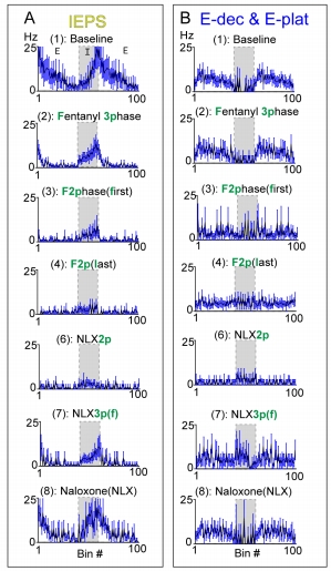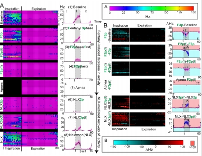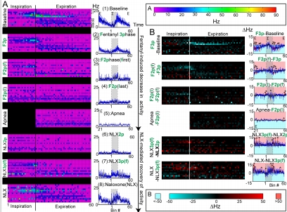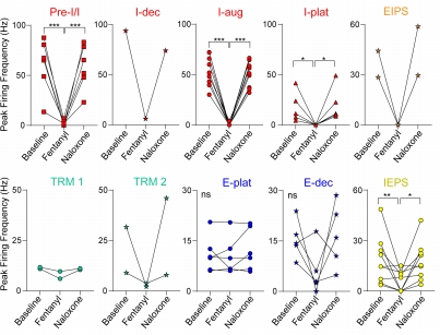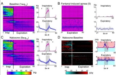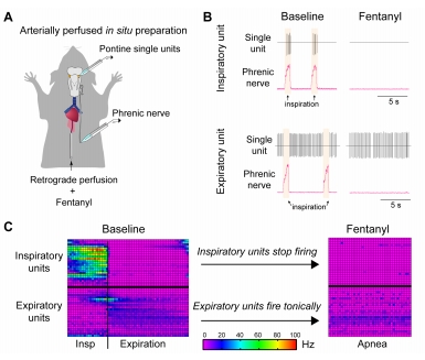 核心發現:芬太尼誘導的呼吸暫停(apnea)中,吸氣神經元(inspiratory neurons)活動顯著抑制(78%完全沉默),而呼氣神經元(expiratory neurons)雖放電頻率降低但仍維持緊張性放電(79%持續活動)。