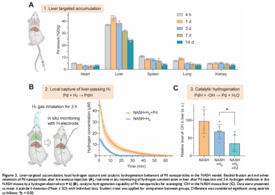 Pd納米顆粒通過儲(chǔ)氫-催化雙功能實(shí)現(xiàn):①肝臟靶向氫富集 ②·OH高效清除。