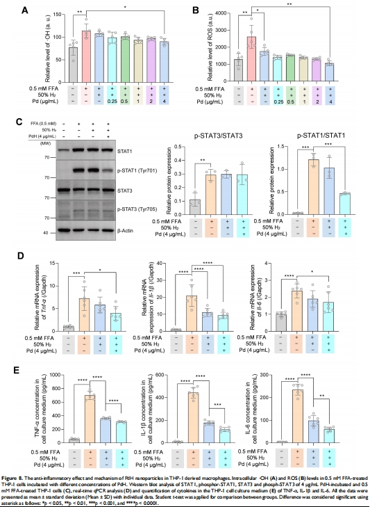 在FFA誘導(dǎo)的THP-1巨噬細(xì)胞中,PdH+H?使細(xì)胞內(nèi)ROS降低60%(圖8A-B)。