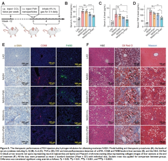 在小鼠非酒精性脂肪性肝炎(NASH)模型中,該策略使血清炎癥因子(IL-1β/TNF-α/IL-6)降低2-3倍(圖4D-F),肝脂質(zhì)沉積減少40%(圖4G)。