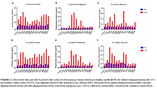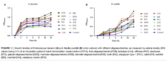 GOS和FOS顯著促進E. faecium和B. subtilis生長(圖1A-B)。