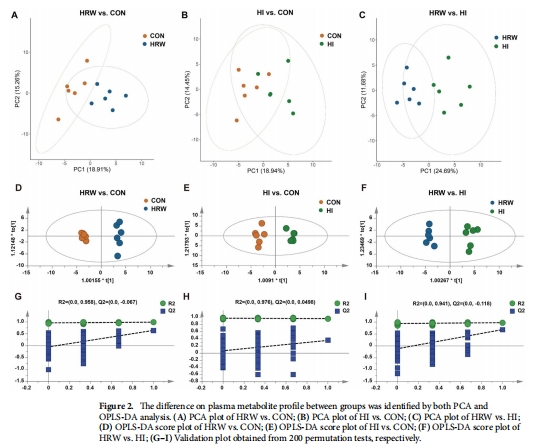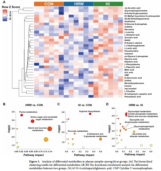 代謝差異:HRW下調14種血漿代謝物(主要涉及淀粉/蔗糖代謝),HI上調10種代謝物(主要涉及精氨酸生物合成)(圖3)。