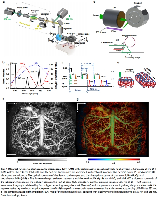 本文提出了一種超快功能光聲顯微鏡(UFF-PAM),通過雙波長激光激發(532 nm和558 nm)、水浸式12面體掃描儀、深度學習圖像上采樣等技術創新,實現了小鼠全腦微血管水平的血流動力學和氧合狀態的實時成像。