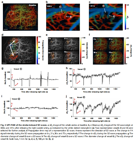 腦卒中模型:首次捕獲皮層擴散性去極化(SD)波的血管收縮與缺氧傳播(圖5)。
