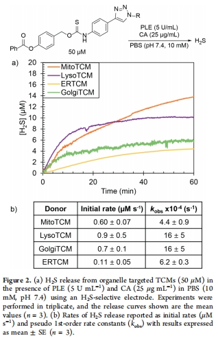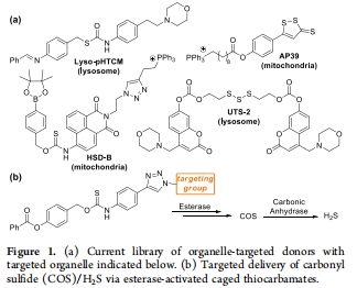 本文開發了首個亞細胞器靶向的硫化氫(H?S)供體庫,通過將高爾基體、溶酶體、內質網(ER)和線粒體的靶向基團與硫代氨基甲酸酯(TCM)支架結合(圖1b),實現了H?S在特定細胞器的定位釋放。