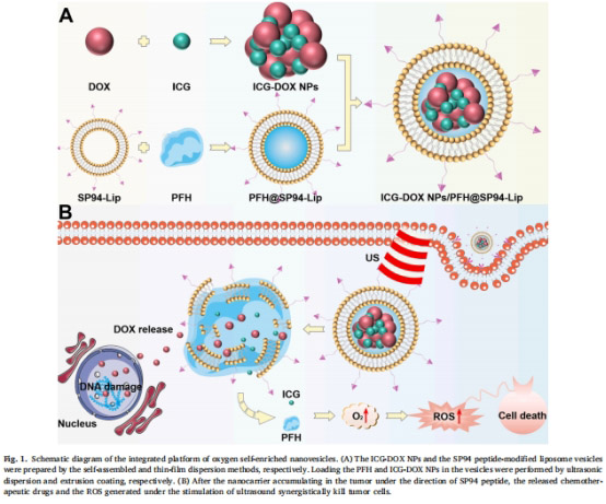 本研究開發了一種負載SP94肽的氧自富集納米囊泡(ICG-DOX NPs/PFH@SP94-Lip),通過整合化療(阿霉素DOX)、聲動力治療(SDT,聲敏劑ICG)和缺氧緩解(攜氧劑PFH)三重策略治療肝癌。核心發現: