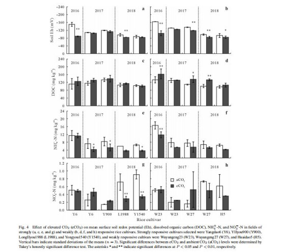 論文通過中國亞熱帶稻田的多年原位FACE(Free-Air CO? Enrichment)平臺實驗(2016-2018年),研究了高濃度CO?(eCO?,比環境CO?高200 μmol mol?1)對兩種響應性差異水稻品種(強響應型:Yangdao6, YIIyou900等;弱響應型:Wuyungeng23, Huaidao5等)稻田CH?和N?O排放的影響。結果表明: