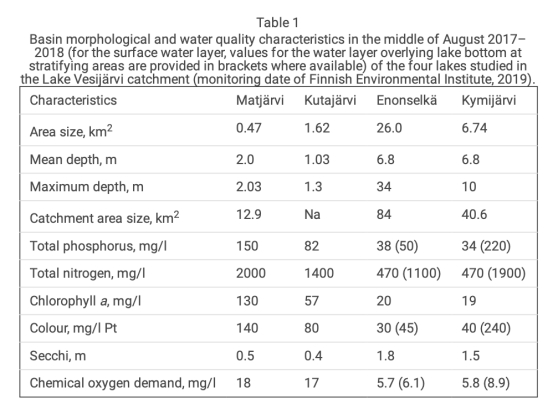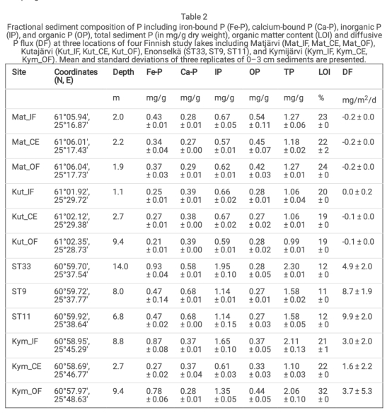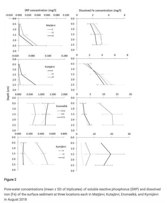 ? 采集四個(gè)芬蘭湖泊(Matj?rvi, Kutaj?rvi, Enonselk?, Kymij?rvi)的沉積物,分析孔隙水磷/鐵濃度、沉積物有機(jī)質(zhì)(LOI)、磷形態(tài)組成,計(jì)算擴(kuò)散通量(DF);