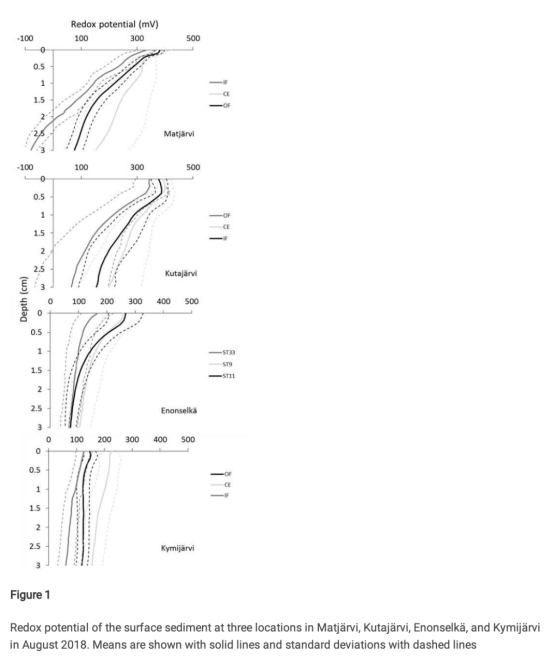 2. 揭示湖泊類(lèi)型差異:淺水湖(Matj?rvi, Kutaj?rvi)沉積物-水界面電位較高(約370 mV),表明氧化環(huán)境抑制磷釋放;深水分層湖(Enonselk?, Kymij?rvi)界面電位顯著降低(最低167 mV),證實(shí)缺氧促進(jìn)磷釋放。