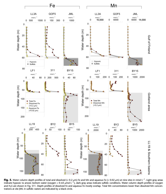 ? 數據:季節性缺氧區釋放最高(Fe: 2.6 mmol/m2/d, Mn: 15.3 mmol/m2/d)