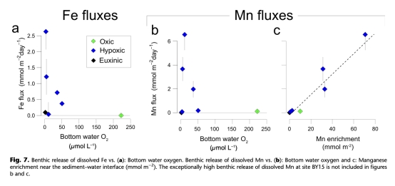 ? 數據:底棲Fe釋放與底層水氧負相關(圖7a),Mn釋放與沉積物Mn富集量正相關(圖7c)