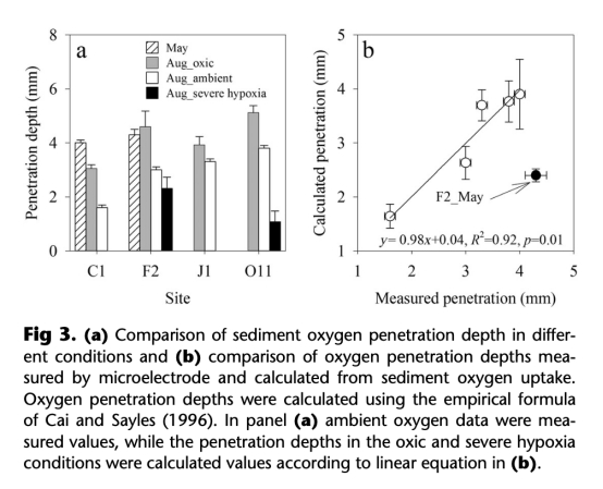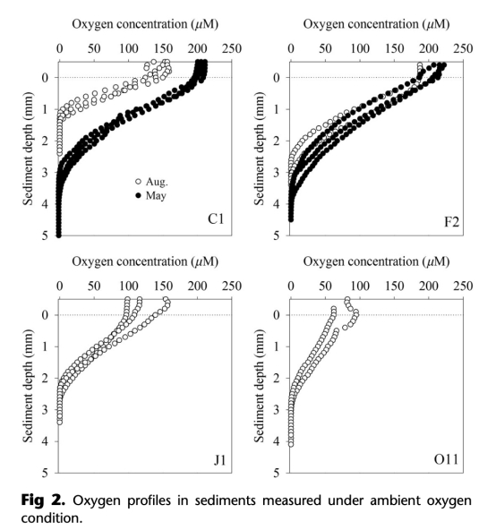 1 底水氧濃度和沉積物氧滲透深度:通過(guò)丹麥Unisense微電極(OX-25)測(cè)量,用于計(jì)算氧滲透深度變化(來(lái)自圖2和圖3)。