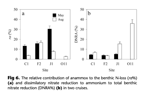 4 厭氧氨氧化(anammox)、反硝化(denitrification)和DNRA率:使用15N同位素技術(shù)測(cè)量,單位為mmol N m?2 d?1(來(lái)自圖6和圖7)。