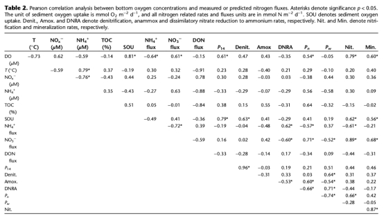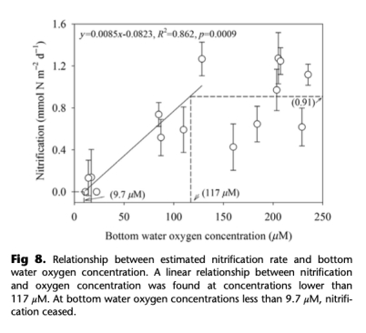 3 底水氧濃度低于9.7μM完全抑制硝化,導(dǎo)致硝酸鹽僅來(lái)自水柱,而銨釋放顯著增加(所有站點(diǎn)0.4-0.8 mmol N m?2 d?1)。