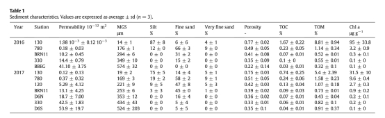 ? 環(huán)境參數(shù):沉積物滲透率、粒度(中值粒徑MGS)、總有機(jī)碳(TOC)、總有機(jī)質(zhì)(TOM)、葉綠素a(Chl a)(表1);