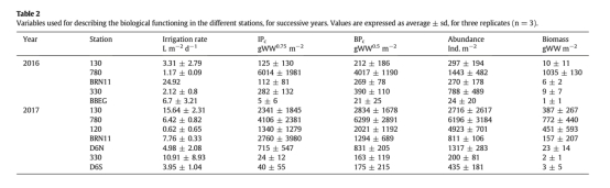 ? 生物參數(shù):大型底棲動(dòng)物豐度/生物量、生物擾動(dòng)潛力(BPc)、灌溉潛力(IPc)、實(shí)測(cè)灌溉率(表2);
