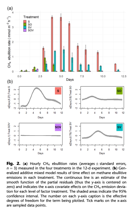 4. 統計分析:廣義加性混合模型(GAMM)分析甲烷排放時序變化(圖2b),混合效應模型檢驗處理間差異(表1)。