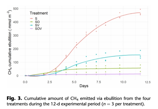 ? 數據:裸露沉積物(S)累計排放470±22 mmol CH4 m?2;植被(SV)減少67%,蠕蟲(SO)減少88%,協同處理(SOV)減少97%。