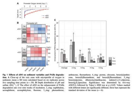 ? 理化參數:毫米級溶解氧/pH剖面(Unisense微電極,圖1A,B)、硫酸鹽、PAHs濃度(圖1C)