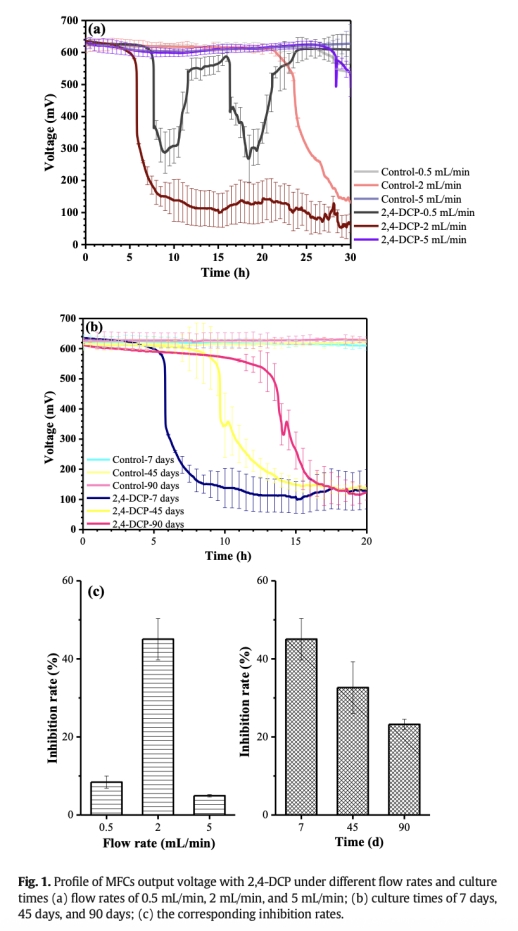 1. 實驗設計:構建雙室MFC,對比不同流速(0.5/2/5 mL/min)和培養時間(7/45/90天)下的毒性響應(以2,4-二氯苯酚為模型毒物)。