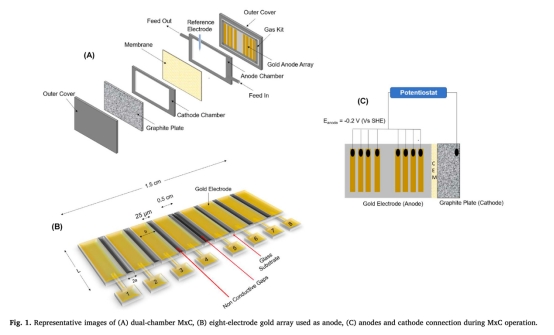 1. 實(shí)驗(yàn)設(shè)計(jì):構(gòu)建雙室MXC,采用八電極金陣列陽(yáng)極(圖1A-C),分四階段操作:Phase 1(穩(wěn)態(tài)薄生物膜)、Phase 2(增厚生物膜)、Phase 3(乙酸饑餓)、Phase 4(底物恢復(fù))。