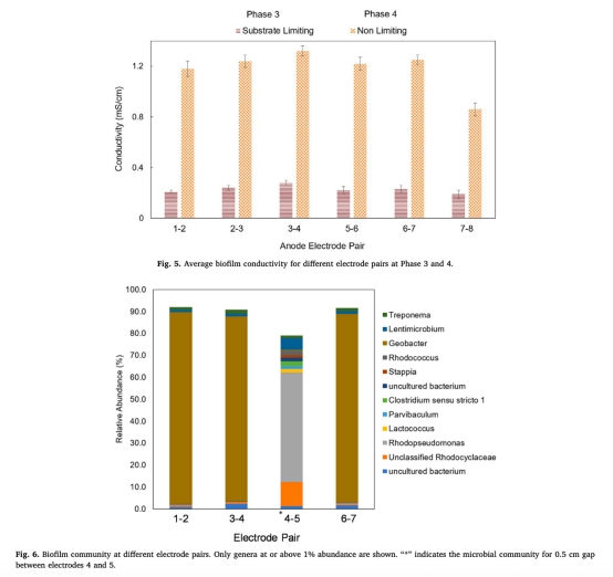 3. 微生物分布:Geobacter在25μm電極間隙區(qū)域占比超85%(圖6),但在0.5 cm寬間隙區(qū)僅占1%,被紅假單胞菌(Rhodopseudomonas sp.,52%)取代,表明長(zhǎng)距離電子傳遞存在菌種特異性限制。