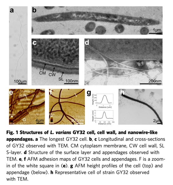 本文首次報道了一種絲狀革蘭氏陽性菌(Lysinibacillus varians GY32)具備雙向胞外電子傳遞(EET)能力。該菌株可在微生物燃料電池(MFC)中形成厘米級導電細胞網絡,細胞長度可達1.08毫米。通過原子力顯微鏡(AFM)和微電極分析,發現其導電性與類似菌毛的蛋白質附屬物相關。結果表明長距離電子傳遞(LDET)不僅限于革蘭氏陰性菌。