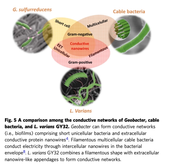 2. 新導電模式:提出第三種LDET機制——單細胞絲狀菌通過導電蛋白質附屬物形成網絡(圖5),區別于革蘭氏陰性菌的菌毛(如Geobacter)或多細胞電纜菌的包膜傳導。