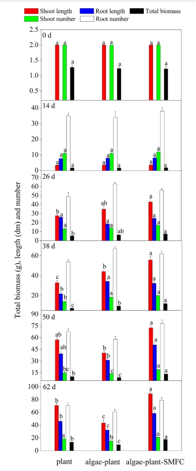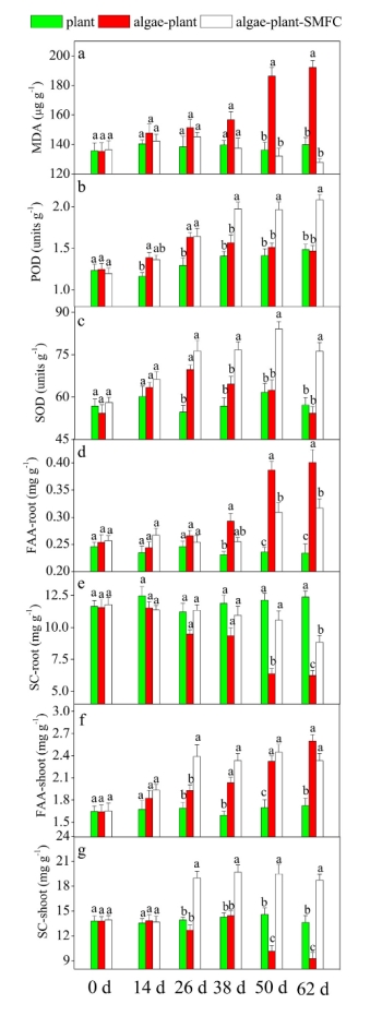 ? SMFC使藻類+植物+SMFC組的根系MDA降低至139.8 μg/g。