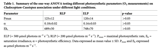 ? 揭示即使光強倍增(200→500 μmol photons),水母的碳固定效率不變(Pmax無差異),推翻"高光需代謝調整"假設。
