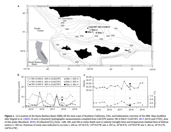 1. 樣本采集:在圣巴巴拉盆地三個(gè)低氧站點(diǎn)(水深420–567 m)采集沉積物巖芯和底層水樣本,測量原位溶解氧(丹麥Unisense微電極)和孔隙水金屬濃度。