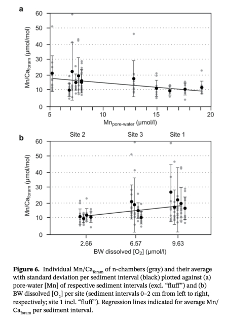 4. 數(shù)據(jù)關(guān)聯(lián):將Mn/Ca與底層水[O?](圖1b, 2a)和孔隙水Mn(圖2b)進(jìn)行統(tǒng)計(jì)相關(guān)性檢驗(yàn)(圖6)。