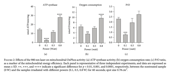 1. 靶向性調控:980nm激光特異性激活線粒體復合物III和IV,且存在功率依賴性"窗口效應"(0.8W最佳)。