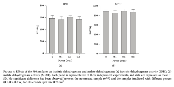 研究首次證明980nm激光可調控牛肝線粒體呼吸鏈復合物III和IV的活性,并影響ATP合成與氧化應激水平。低功率(0.1–0.2W)抑制ATP合成并誘發呼吸鏈解耦聯;中功率(0.3–0.7W)無顯著效應;高功率(0.8–1.1W)通過激活復合物III和IV提升ATP產量(圖1)。1.2–1.4W時ATP恢復至基線水平。激光還通過增加氧耗(圖2b)誘導活性氧(ROS)積累和脂質過氧化(圖5),但未影響三羧酸循環酶活性(圖4)。
